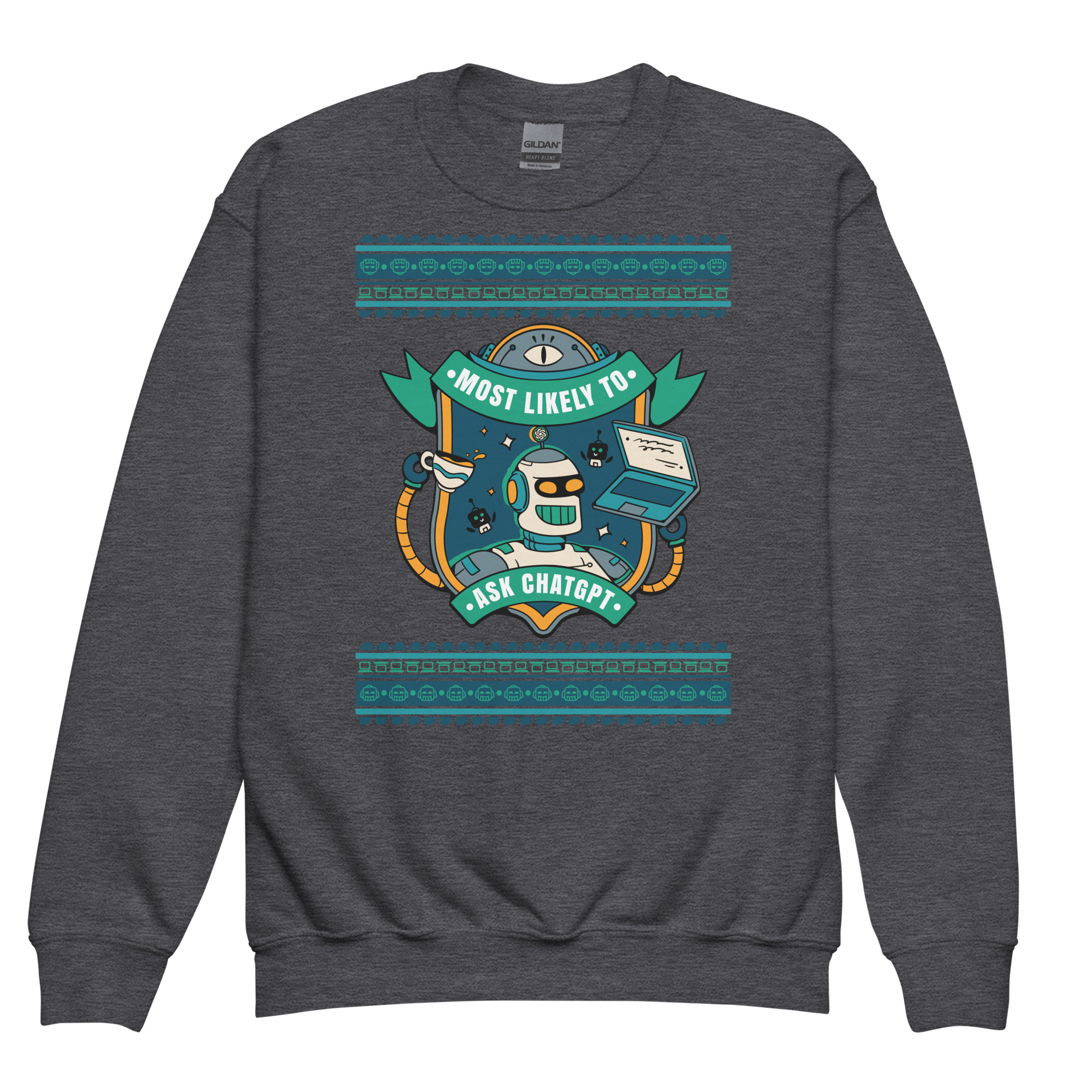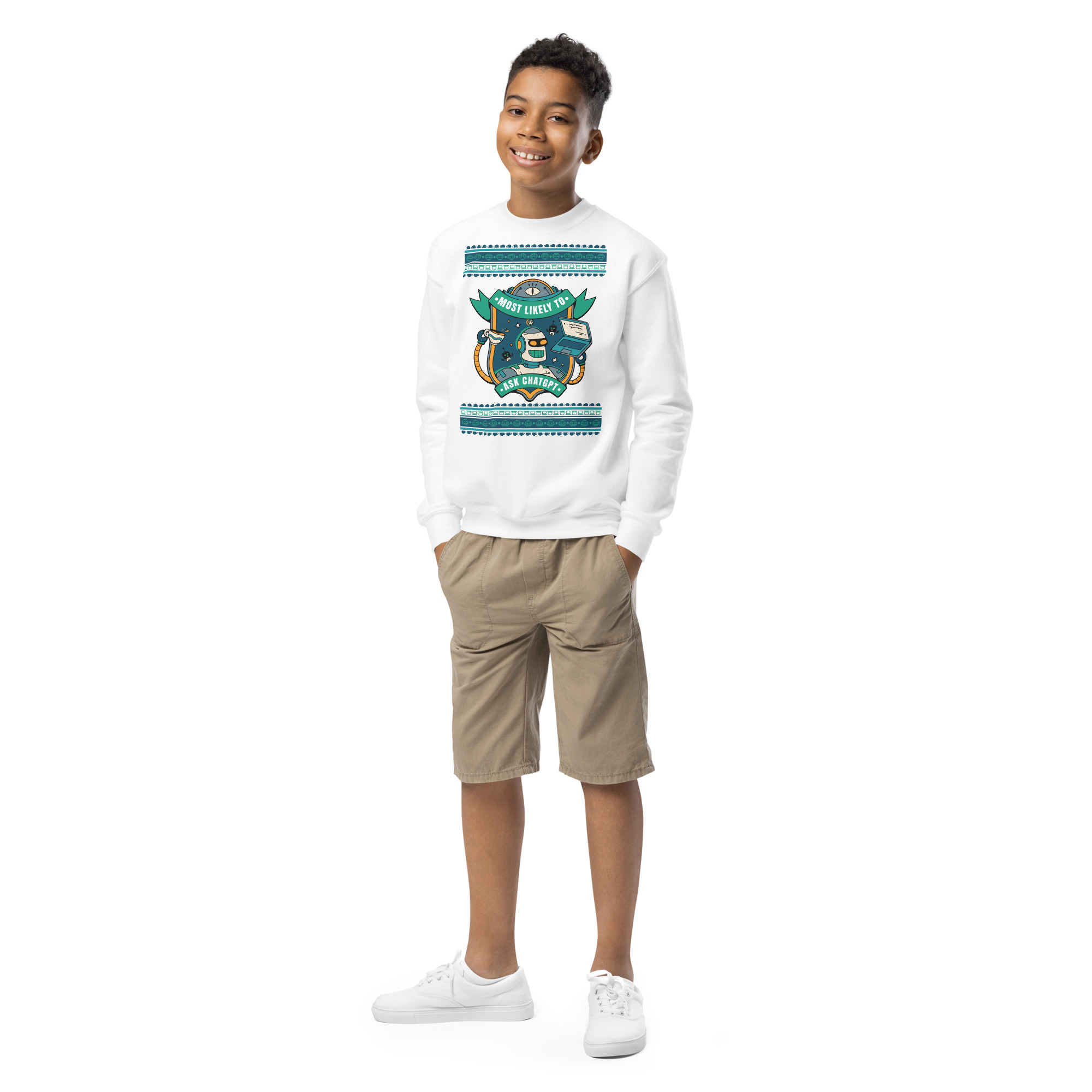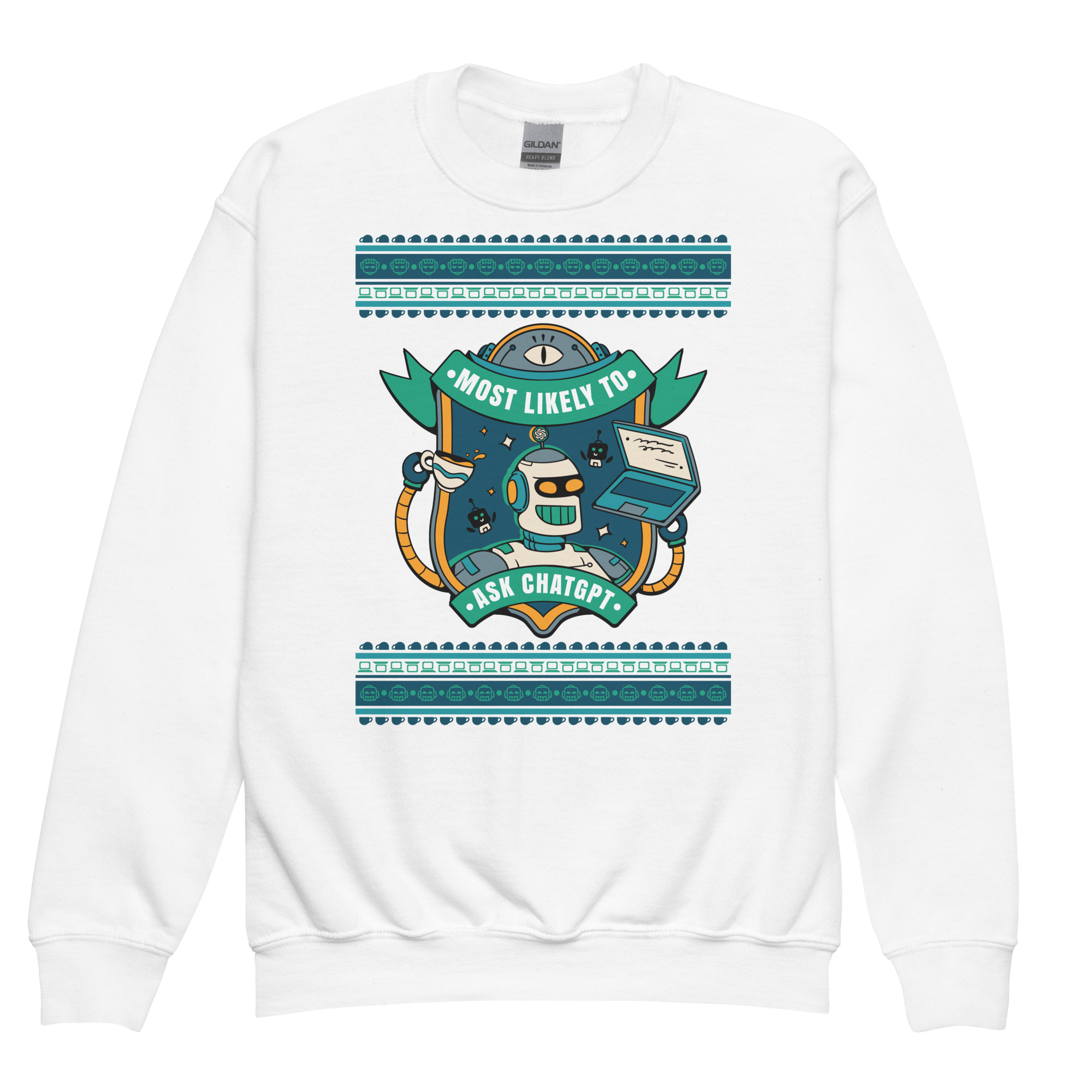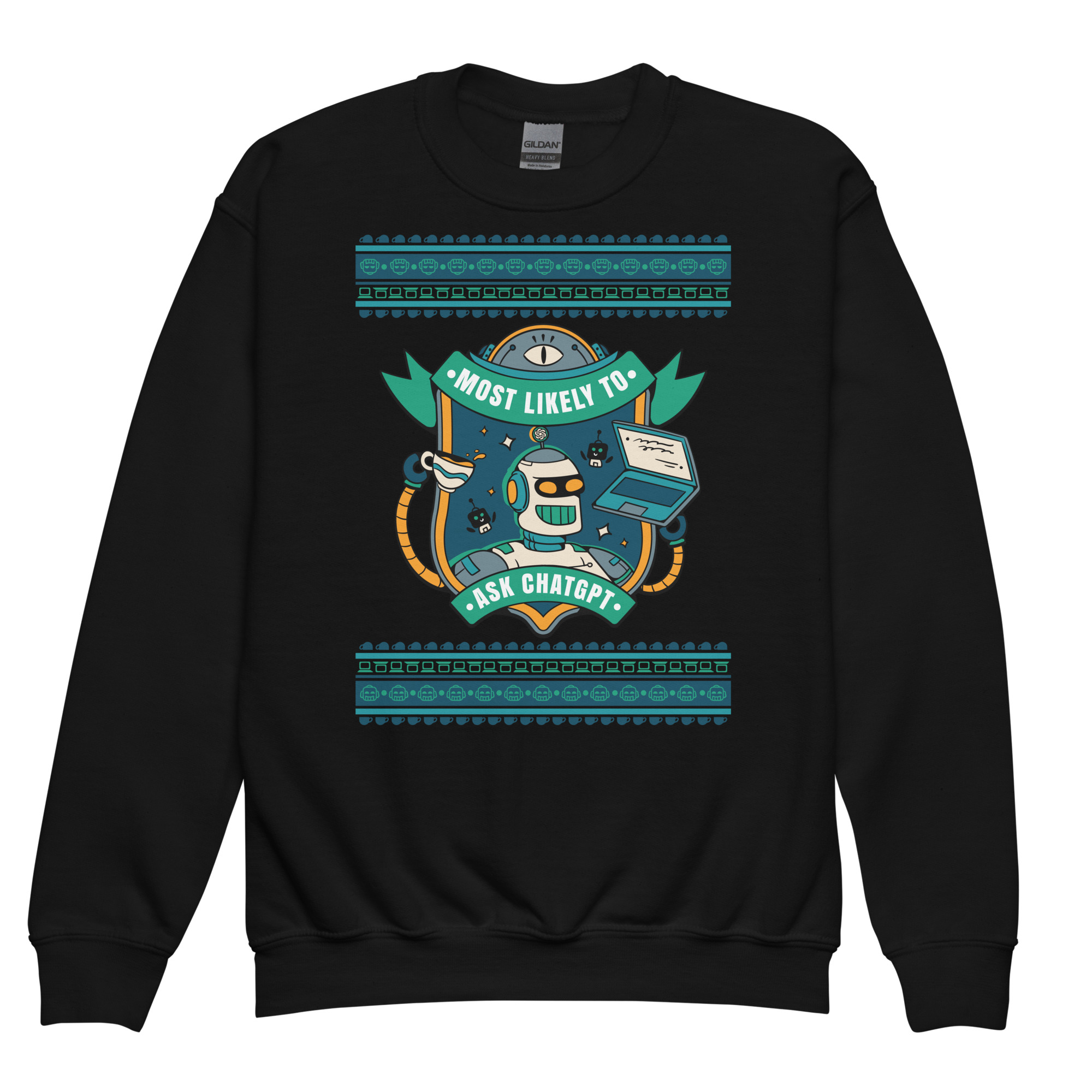 For the overachieving kid who lets AI do the real heavy lifting. Rock this geek-chic kids’ sweatshirt crowned with a beaming robot, coffee in one hand, laptop in the other, and a vibe that screams, “Don’t ask me, ask ChatGPT.” Whether you’re crushing code or crafting clever comebacks, this one’s for the prompt-perfect party pro.
