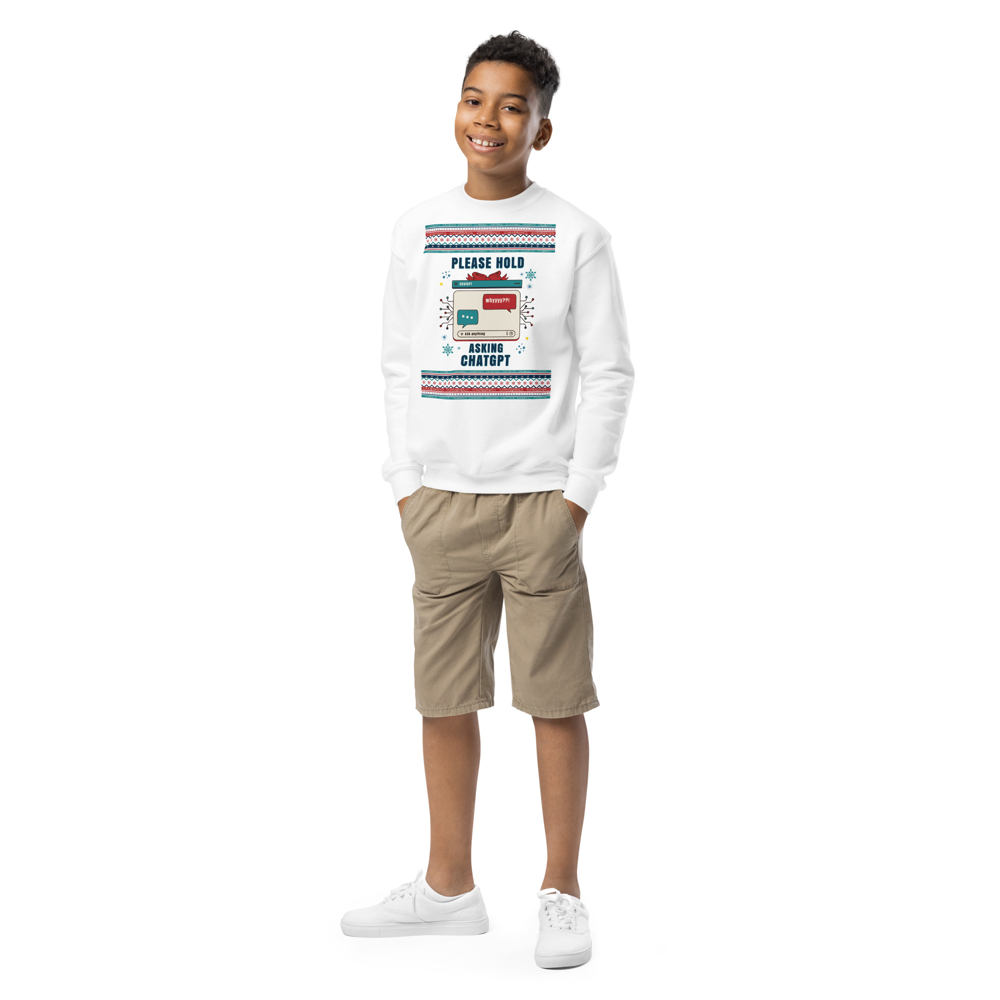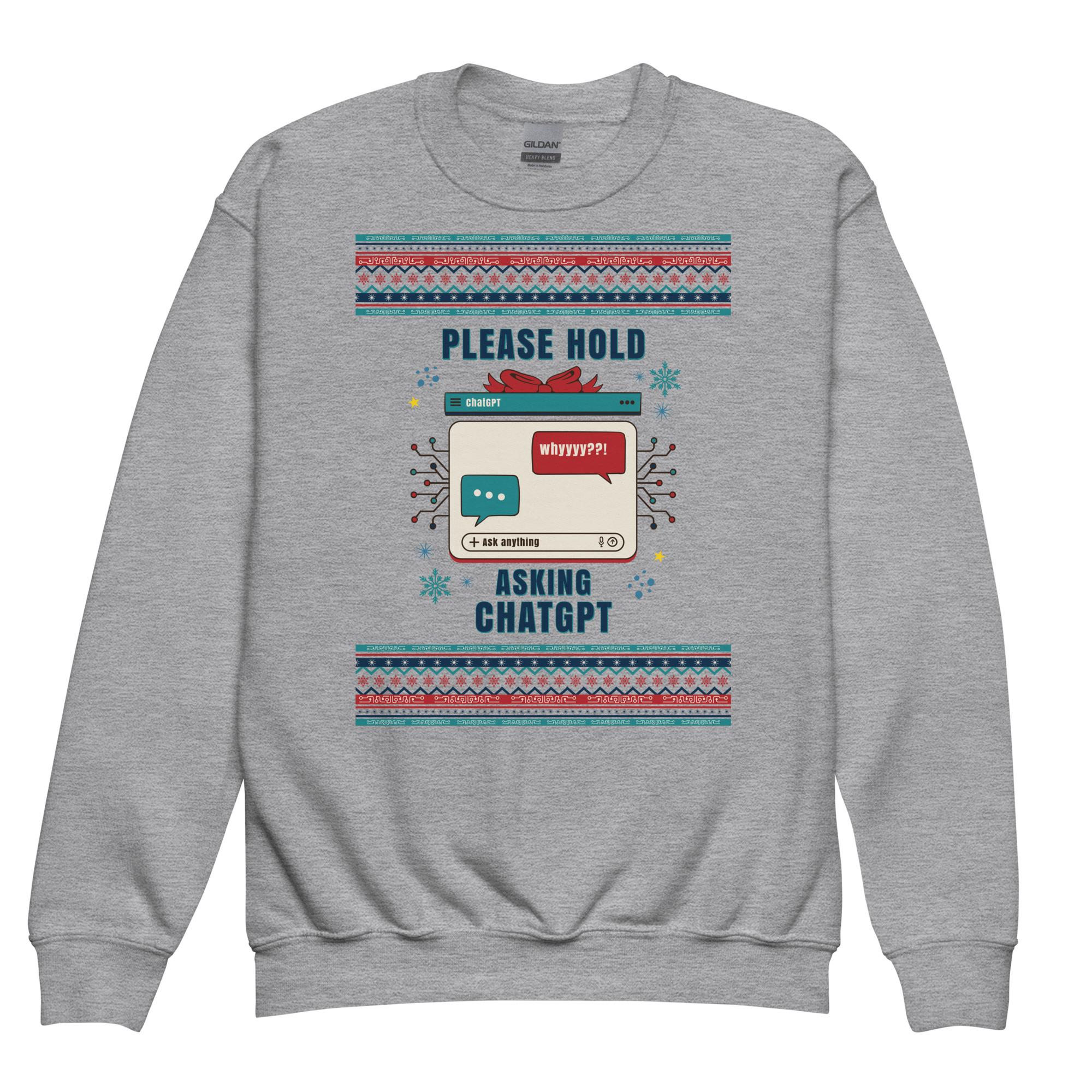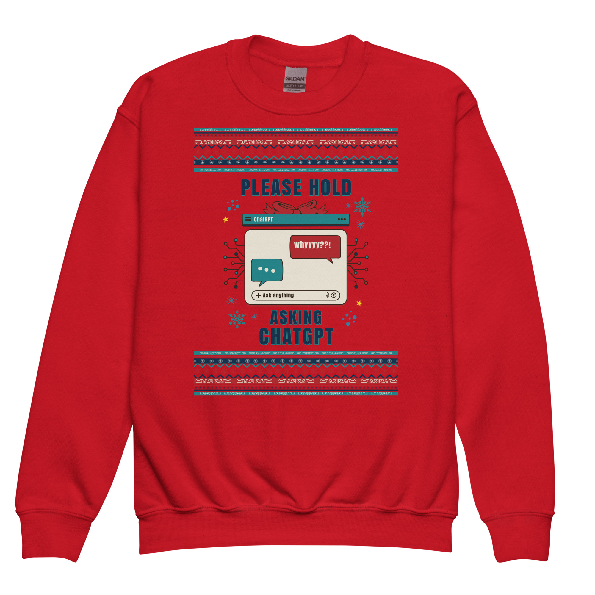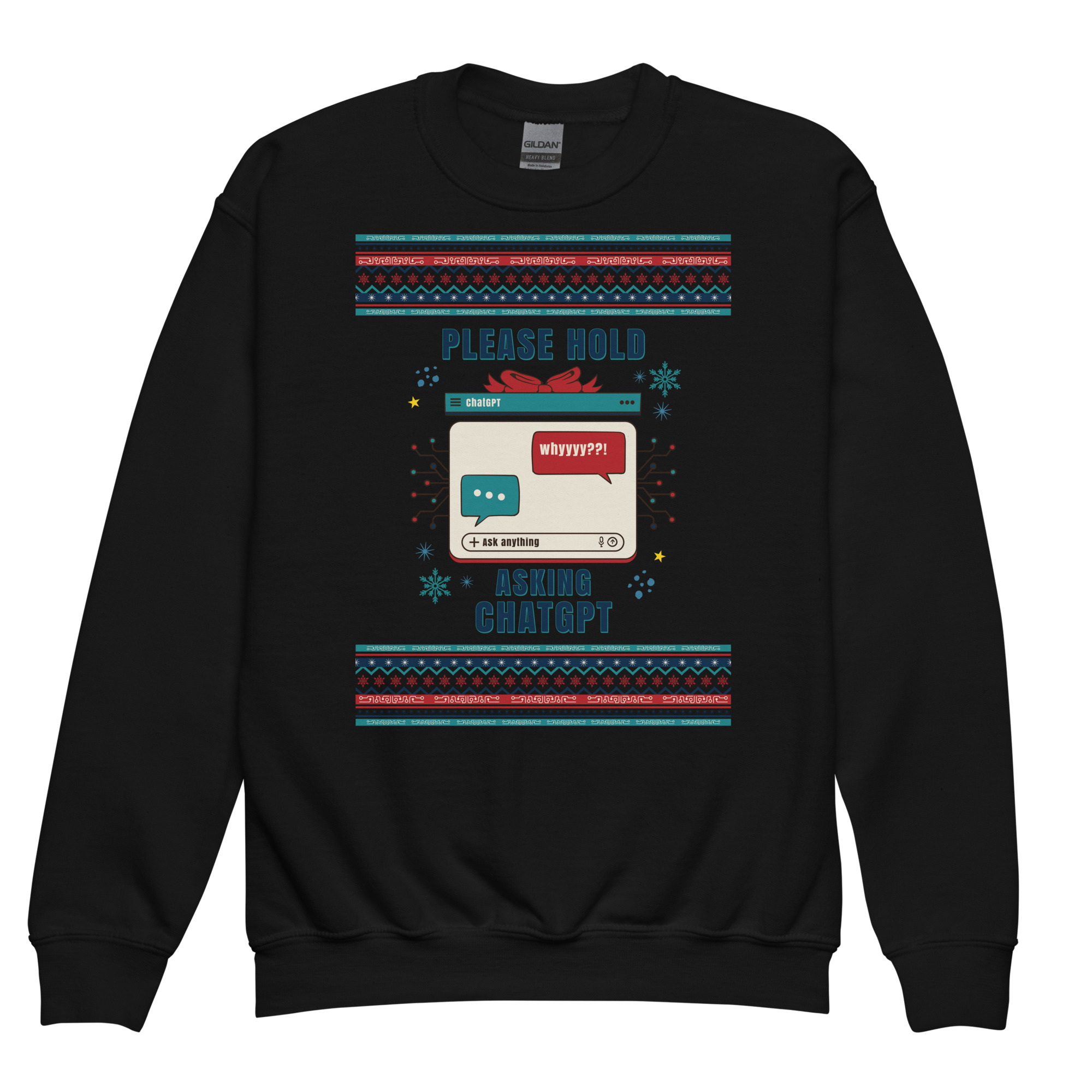 This design is peak holiday chaos meets 2025 tech addiction—and we are here for it. With retro pixel snowflakes, glitchy chat bubbles, and that oh-so-familiar “Please Hold” screen, it perfectly captures the modern mood: festive, confused, and completely reliant on AI to survive small talk with relatives. It’s like your brain buffering at a family dinner—wrapped in tinsel.
