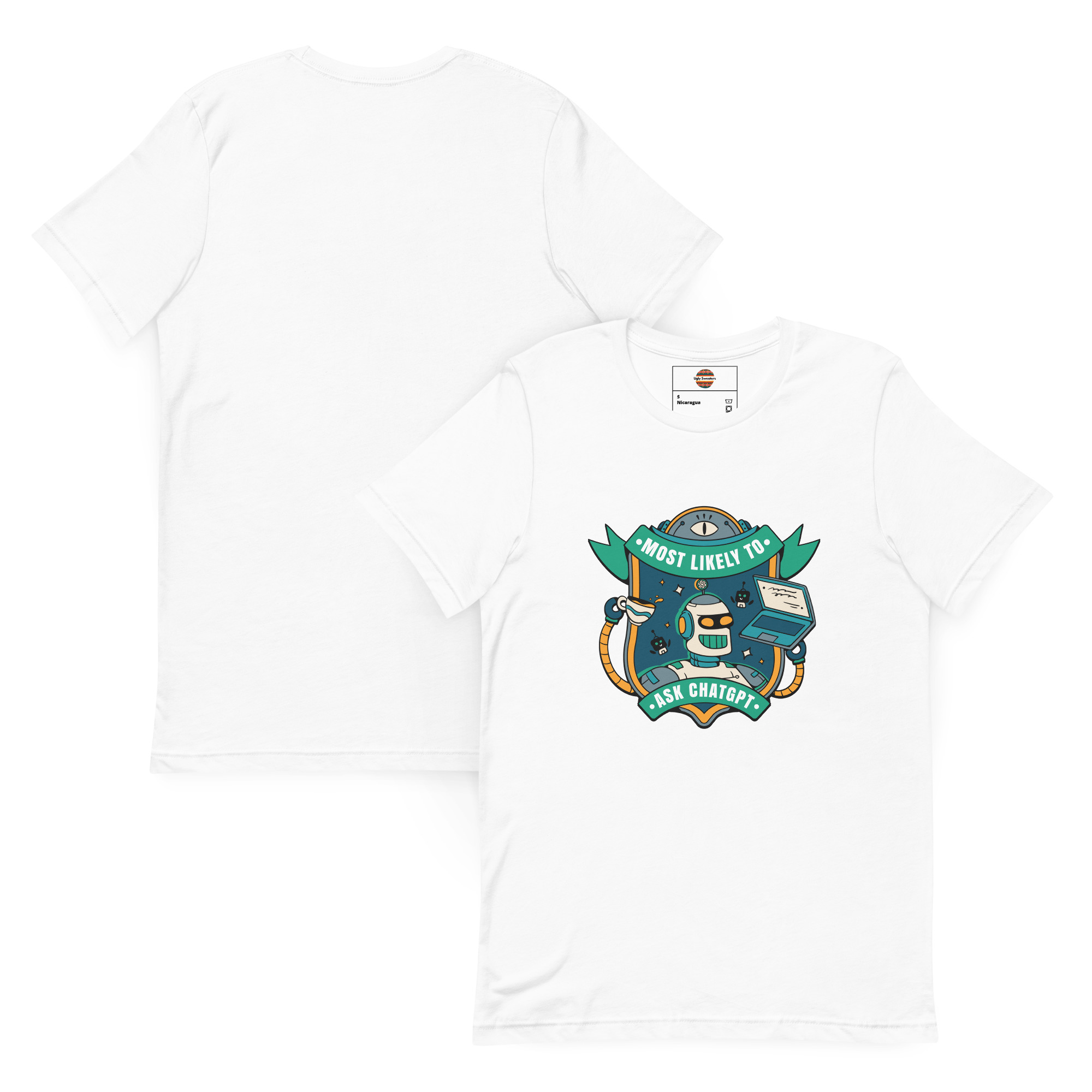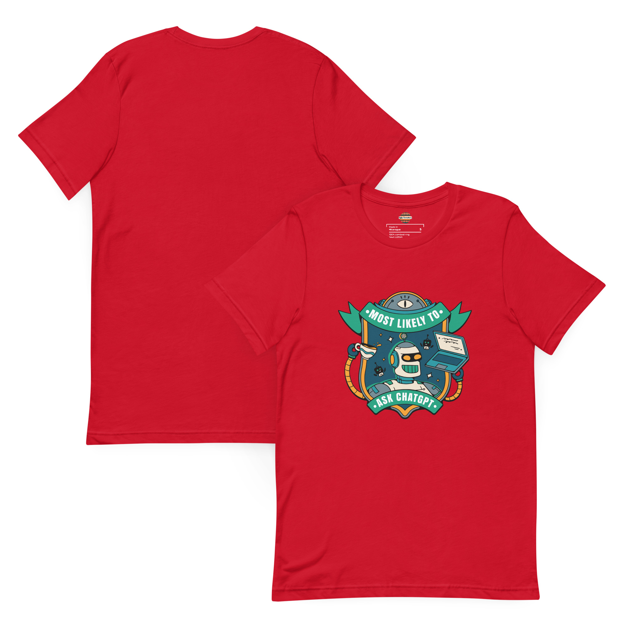 For the overachiever who lets AI do the real heavy lifting. Rock this geek-chic ugly sweater crowned with a beaming robot, coffee in one hand, laptop in the other, and a vibe that screams, “Don’t ask me, ask ChatGPT.” Whether you’re crushing code or crafting clever comebacks, this one’s for the prompt-perfect party pro.